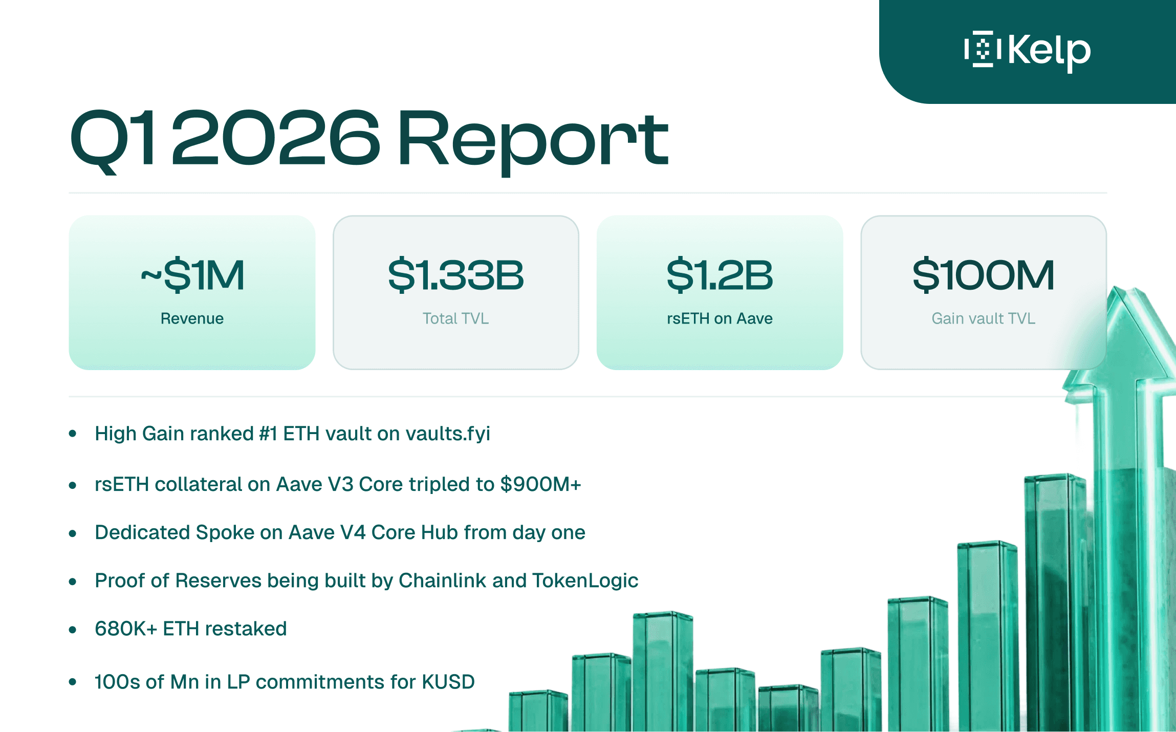 Q1 2026 was Kelp's strongest quarter since launch. Total TVL reached $1.33B, rsETH supply across Aave grew to $1.2B, Gain vaults crossed $100M in combined TVL with the #1 ETH vault ranking on vaults.fyi, and KUSD moved from framework to live execution with hundreds of millions in LP commitments secured.